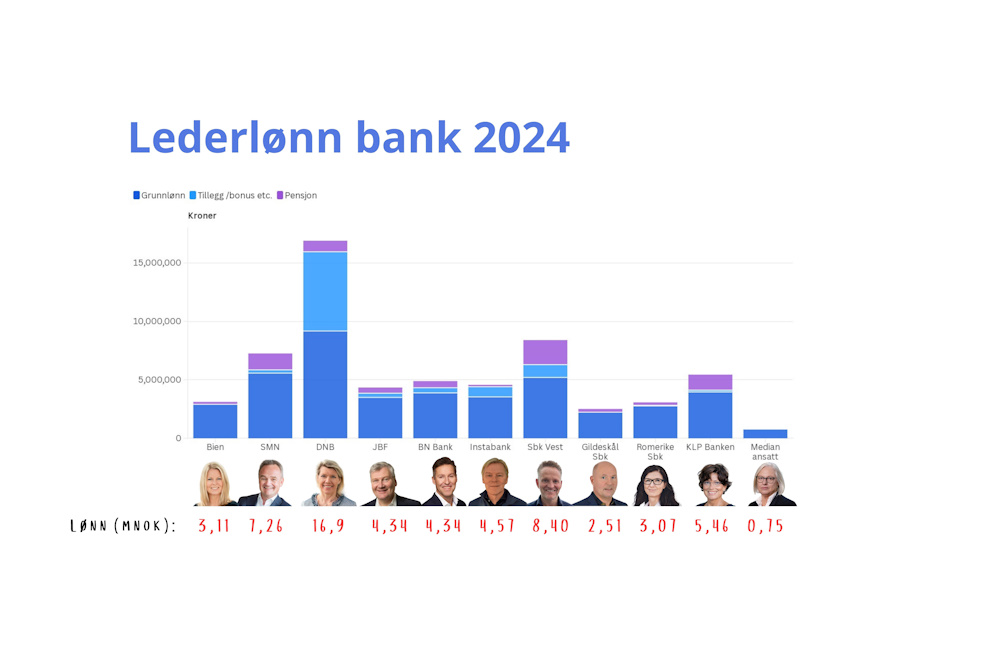 Der stopper finanstoppenes måtehold. 10 av 13 ledere hadde høyere grunnlønnstillegg enn de ansatte fikk i lønnsoppgjøret 2024. Fire banksjefer har fått jekket opp grunnlønnen med tosifret prosenttillegg.