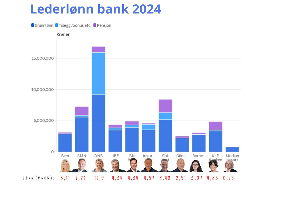 Der stopper finanstoppenes måtehold. 10 av 13 ledere hadde høyere grunnlønnstillegg enn de ansatte fikk i lønnsoppgjøret 2024. Fire banksjefer har fått jekket opp grunnlønnen med tosifret prosenttillegg.