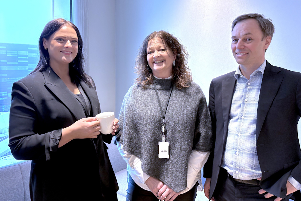 TRAVLE DAGER: Det er full fart i Ergo Forsikring, noe finansmedarbeider Astrid Risan (tv), hovedtillitsvalgt May Egge-Sund og daglig leder Petter Hansen kan bekrefte. (Foto: Linda Fure/Ergo)